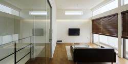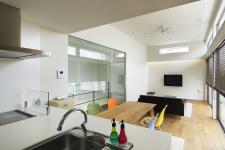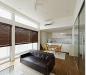 The living/dining room and hallway on the second floor are partitioned by a transparent glass screen to provide openness while ensuring air conditioning efficiency. On the south side of the open living/dining room with high ceilings, a large window is installed to allow bright natural light to stream in and allow the residents to feel nature. Wooden blinds are installed on the windows to control natural light and ensure privacy.