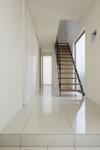 The floor of the entrance hall is paved with stylish white porcelain tiles, and the staircase from the hall to the second floor is an open and light skeleton staircase, creating a sophisticated atmosphere.