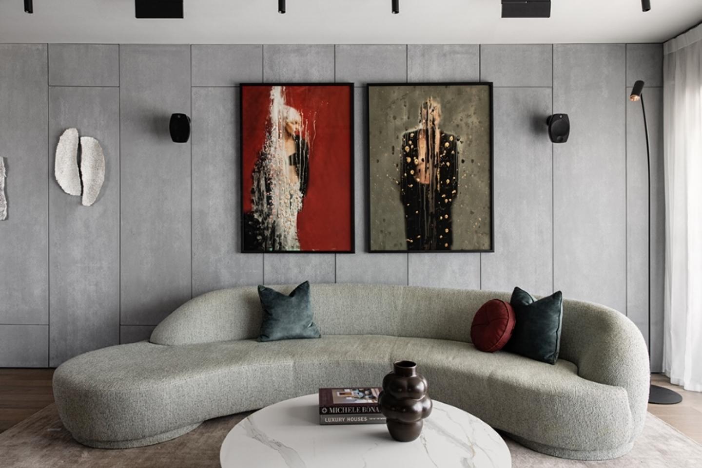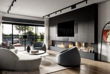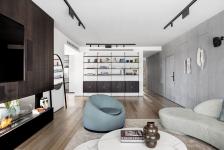 The graded design begins in the living room, mainly used by the family in the evenings and designed in darker tones. In its center lies an amorphous sofa upholstered in French fabric and round armchairs. The aim of the rounded geometry is to soften the straight geometry, but there's an added dimension here: the family loves the sea, and the maritime wonder is reflected throughout the apartment in subtle ways," explains Kazayoff. "We chose not to go for obvious sea motifs and instead inserted distinct maritime elements in organic and amorphous forms with sandy hues that mimic the movement of the waves. The fireplace wall in the living room blends iron construction, black-stained veneer, and glass, serving as storage while housing a drinks bar.
