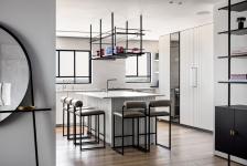 "The iron and black-stained veneer present in the living room are also the materials from which we created the library that stands against the wall leading to the kitchen, designed in much lighter tones," says Kazayoff. "Despite its darkness, it's light and airy, serving as a connecting element between the spaces: a sort of pause between the current drama in the dark living room and the open, bright, and airy kitchen."