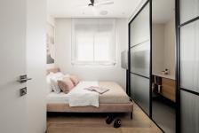 Thanks to the new layout and a different approach to the master parents' functions, it has become much more spacious. Now, between the sleeping area and the bathroom, a tall wardrobe axis separates them, with two fluttering fronts, two of which serve as the entrance door to the bathroom. "We integrated the maritime presence here as well and amplified it," explains Kazayoff. "In the center of the master bedroom, painted in a light sandy hue, stands a round bed in a shade of deep blue – a representation of the sea. The freestanding wardrobe dividing the functions is light, airy, and metallic, reminiscent of the open design prevalent in the Mediterranean basin countries – one can imagine the sea breeze passing through. The master bedroom's terrace section turned into a wardrobe room defined by a ceiling and glass walls, which can be opened at any time. The wardrobes are on wheels, allowing their positions to be changed as needed."