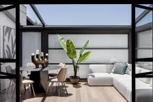 The kitchen cabinet fronts were cut and painted in a light gray shade. Two asymmetrical surfaces were integrated into the tall wall, with reflective glass panels and internal lighting, where serving dishes and food are stored. Above the island hangs an iron construction that serves as a decorative installation for displaying elegant utensils: "This element, made of Belgian profile, anchors the island in the space and stands out prominently against the light background. It acts as a connecting axis between the kitchen and the dining and lounge areas through the adjoining terrace enclosed by dark Belgian profile. For this area, we created a transparent, retractable, and foldable canopy ceiling, which can be closed to turn the open terrace into an internal room usable in any weather. We placed a large round dining table there, perfect for family meals, and next to it, a deep and comfortable L-shaped sofa for relaxing during or after meals."