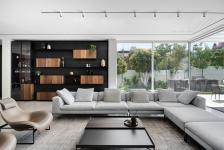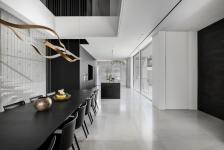 The exposed concrete wall continues into the living room, maintaining a completely clean look except for the television hanging on it. As part of the monochromatic scheme of the living room, the design fluctuates between light tones on the concrete walls and white walls, in furniture pieces and in a bright off-white floor, juxtaposed with a black iron and wood bookcase, balancing the room's light tone and adding warmth. The metal bookcase complements the black kitchen, finished in a soft nano-black appearance, almost matte, providing a silky touch sensation. At the center of the kitchen is a niche with stone, and its wall rotates towards the stairs, ascending to the upper floor. "We wanted the kitchen wall to become a covering that complements a kind of cube rising upward, because even while ascending the stairs, you can still see the wall coming from the kitchen," Israelovich elaborates.