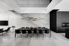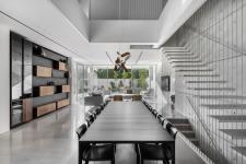 The ground floor includes the living room, kitchen, guest services, and a utility room, all planned so that the living room and kitchen are open to each other. Facing the entrance door is the dining area with a unique lighting fixture hanging over it, made of polished steel and suspended from the upper part of the house. "The first thing you encounter upon entering the house is a dining table with significant lighting fixtures," Israelovich explains. "Opposite the entrance is an exposed concrete wall with minimalist floating stairs made of steel, almost disappearing due to the use of a material very similar to the exposed concrete on the wall, and beside them are metal cables serving as the staircase railing. This entire space creates a dance - a dance between the lighting fixtures and a dance intertwined with the staircase strings. That's how we created a very intriguing play even at the first glance into the house."