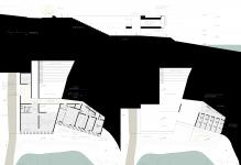 The cantilevered structural components will be in steel coated with a high degree of insulation. The glazed surfaces were placed only exclusively to the south and shielded by vertical brise-soleils capable of mitigating heat gain during the summer. Season in which, when possible, natural cross-ventilation can be exploited. This, thanks to the sequential arrangement of some windows, or to the chimney effect (office area) for a skylight on the roof. In this sense, the shape of the amphitheater will also make it possible, through the exploitation of the Venturi effect, to make warm summer evenings milder while participating in cultural events. In this synoptic framework, economic feasibility was also pursued by adopting natural and recyclable materials such as different local stones for facade cladding. Materials that do not require much maintenance over time and that at the same time evoke the stratifications of the adjacent rocks, in the colors and textures.