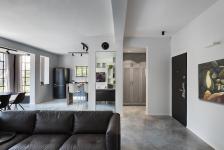 The prevailing atmosphere in the space is that of a modern urban loft. The color scheme is monochromatic with subtle touches of color. A wardrobe was designed at the entrance, creating a sense of space and providing storage for personal items, aiding in organizing before leaving the house.