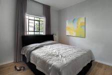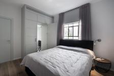 In the private section of the home, a master suite was designed with an adjoining bathroom, an additional bedroom, and a separate bathroom. The bedroom windows were enlarged to maximize natural light intake. The bedrooms were designed in a minimalist style that meets all their needs. The floors are covered with warm wood parquet.