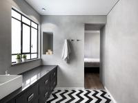 The bathroom in the master suite features tiles made of two types of marble arranged in a FISH-BONE pattern in black and white, while the walls are designed with gray concrete finishes. The additional bathroom walls were also designed with concrete finishes, exuding an urban and clean look.