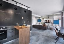 Despite its relatively small size, Zeldman chose dark hues and a minimalist design for the kitchen, as it is used mainly for preparing light meals rather than extensive cooking. Through wood frames undergoing a charred process and monochromatic color schemes, Zeldman gave depth and character to the black kitchen. The refrigerator serves as a central design motif, and the wall leading to the dining area is painted in black, intended for writing with chalk. Circular black ventilated air ducts were integrated into the upper part, providing an industrial look.