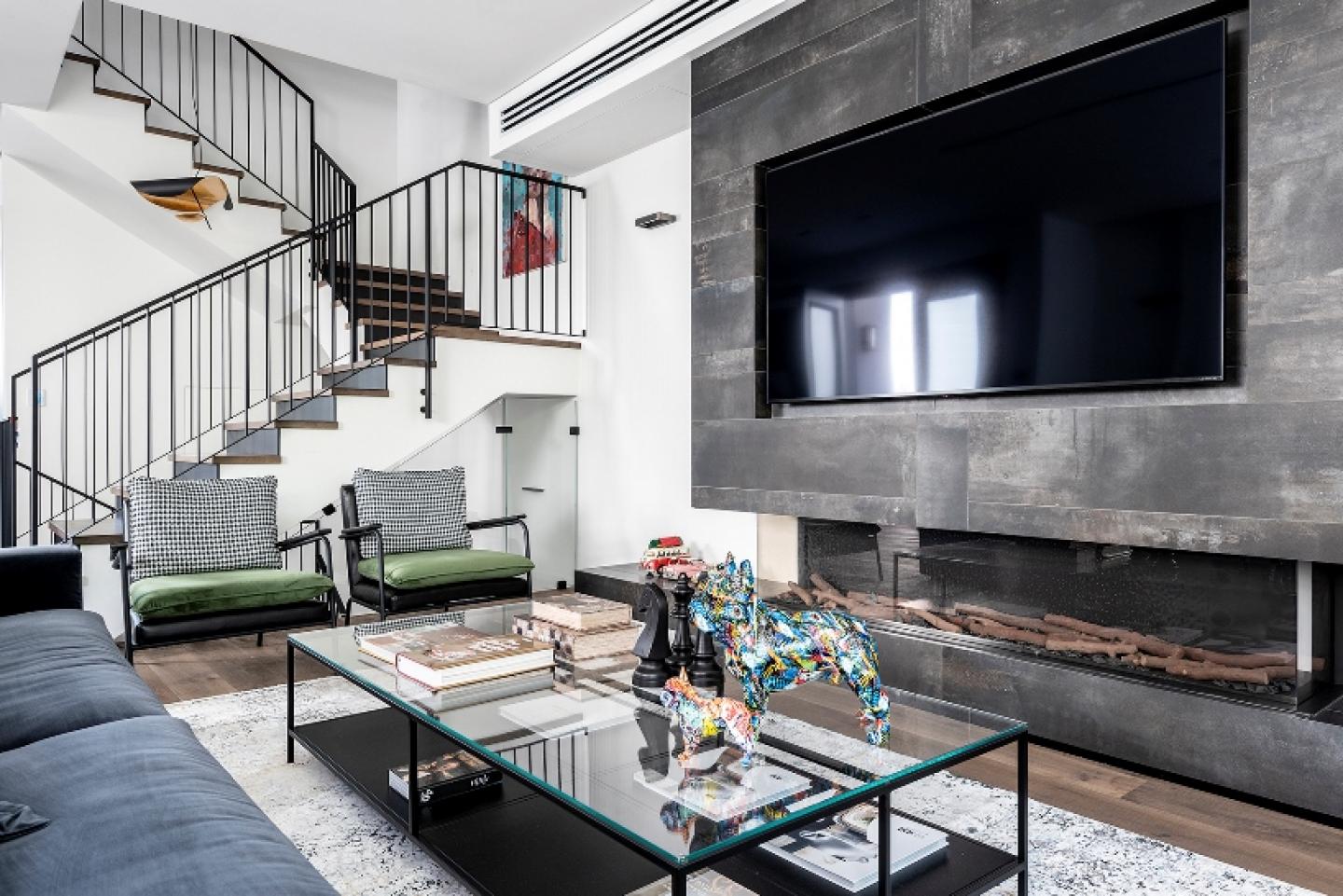 To the right of the entrance door are the living room and dining area. Large vitrines surround the living room and dining area, leading out to the garden. The living room features a dominant wall with a fireplace and a large screen. The fireplace wall is clad in intricate tiles, in an asymmetrical covering. Inviting seating arrangements in a charcoal tone, a coffee table with wood and glass, abundant textiles through curtains and rugs.