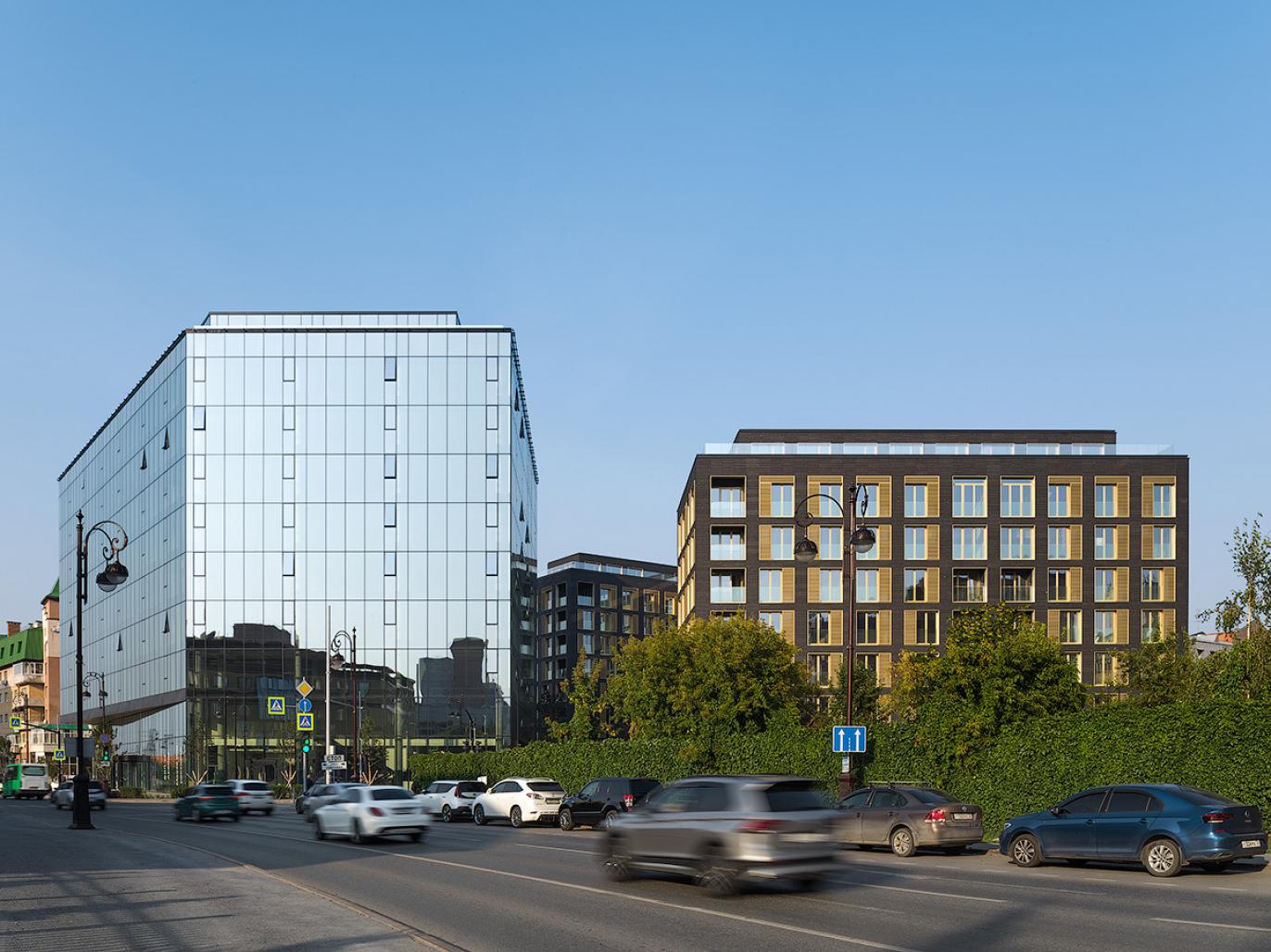 The minimalistic design and architectonic uniformity bring the estate into focus by complementing Tyumen’s historic vista. The project stands a good chance of becoming a new urban landmark.