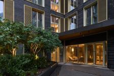 Residential houses are clad with charcoal grey labradorite, and aluminium framed windows of golden beige extending beyond the facade plane accentuate its depth. A matching perforated pane on the window is an element of decor, doubling as a textured shading device in the interior. A regular window pattern makes the houses stand out from the surrounding environment. Based on simplicity and regularity, the office gallery facade is decorated with structured glazing, which accounts for its complex shape with versatile planes and angles. Massive glazing and narrow framing turn the building into an open environment reflecting sun rays and neighbouring houses. Vertical golden beige blades accentuate the building structure and link it to the residential blocks.