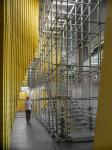 The bare scaffolding and galvanized steel plates emit a cold and stern silver light from the gray ground to the roof. The array of golden glazed tiles rises, forming a future eastern curtain together with the silver scaffolding.