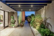 The short facade of the L-shaped building facing the road is covered with Silver Travertine, another characteristic material used on the facade of the villa. This facade includes a two-story opening that illuminates the gallery of the living room and houses an ethanol fireplace in front of it.