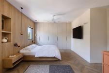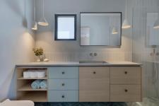 In stark contrast to the light and tranquil communal space and bedroom, designed in light and calm tones, the bathrooms in the house are colorful and vibrant. The floor of the couple's bathroom is covered with colorful porcelain granite tiles. The space itself is spacious, combining pastel shades with oak veneer. Gans chose not to cover all the bathroom walls but only in the "wet" areas to maintain a minimalist appearance. The vanity is exceptionally large, containing plenty of storage space and featuring a concrete surface with an integral sink.