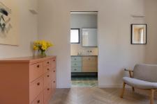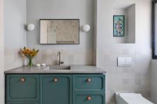 The central bathroom is dedicated to the grandchildren and is designed in a youthful and cheerful style, with bold colors and rounded lines, creating a pleasant atmosphere. The vanity cabinet is painted in a smoky dark green color with orange handles. Here too, the surface is made of concrete, with an integral sink. To complete the look, the designer chose bright tiles for covering the walls and floor, avoiding overwhelming strong colors in the bathroom space.