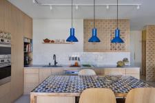 Additionally, the designer chose to remove the dividing wall between the kitchen and the communal area, creating a sense of a spacious, large, and well-lit kitchen. The wall separating the kitchen area and the extensive worktop was complemented by a low wall, completed by Gans's signature wooden elements, allowing the kitchen to expand without darkening it. The kitchen fronts are made of light-colored veneer wood, providing a backdrop for the Moroccan mosaic tiles that the homeowners wanted to integrate into the kitchen. Moreover, a central island was placed in the kitchen, serving both as additional storage and a place for daily seating and dining. Ceramic lamps, handmade in shades of blue, complement the warm and romantic look of the space, combining wood, brass, and rose gold.