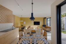 The entire communal space, entirely paved with large gray porcelain granite tiles, was adorned by Gans with shades of brown and cream wood elements, creating a familial and warm look with touches of mustard and blue that added a lot of joy and character. The wooden element begins at the entrance to the apartment, where Gans chose to frame the door and entrance wall with oak frames, providing height and space. The central space is also surrounded by light wood elements designed specifically for the couple, allowing light to enter and create a dominant design as they open 180 degrees.