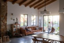 "The style we chose is eclectic fusion. We drew inspiration from various worlds, and here, you can see combinations of rustic elements juxtaposed with bohemian chic details. We tried to keep the spaces as clean as possible and create an uncomplicated design. The calm color scheme, as well as the basic envelope combining wood, stone, and concrete, form a successful backdrop for the garden and art. The segmented concrete flooring, revealing cracks, the rough wood, and stone make this house authentic and less manufactured," explains Ben-David.