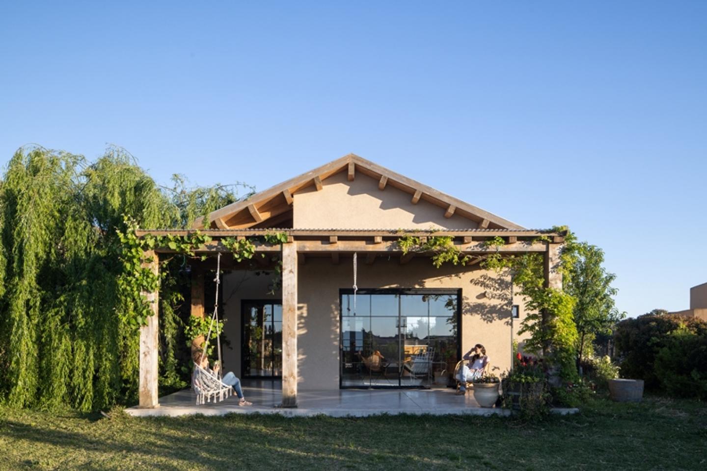 The house is constructed in a 'ח' shape, with two wings connected by a courtyard in its center where a weeping willow is planted. "One of the challenges we faced was bringing southern light into the communal spaces: the kitchen was designed facing south, while the living room and dining area face north towards the courtyard. Around the building's perimeter, particularly in the pergola and column areas, we planted climbing vines. In winter, when there's less foliage, the interior spaces become brighter, and in summer, when the flowering is at its peak, it creates shade and softens the sunlight penetrating through the significant openings."