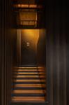 The paper window-shaped low-light molding, the stone-like rough wall, the wabi-sabi bryophytes in the corner, and a small flowing "mountain stream" complement each other. Guests feel as if they arrive at a mountain temple after climbing.