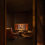 Behind the doors and windows with diamond-shaped lattices is a cavernous cigar room with brick grating sills and a lighting fireplace. The welcoming counter, on the second floor, was created with natural marble with firelight lines, and looks like a fire providing a warm and tipsy feeling.
