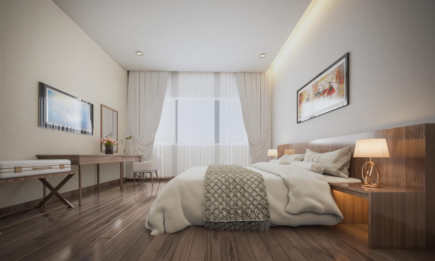 The room is lit by crystal lamps hanging from the ceiling, as well as 2 small night lights placed at the head of the bed, creating a cozy atmosphere in the evening. The room has an air-conditioner near the main door, opposite the bed is a desk, a piano table. The room is more spacious thanks to the use of long rectangular wall paintings, making the room feel longer. The element of spaciousness is the most important thing that the project aims at.