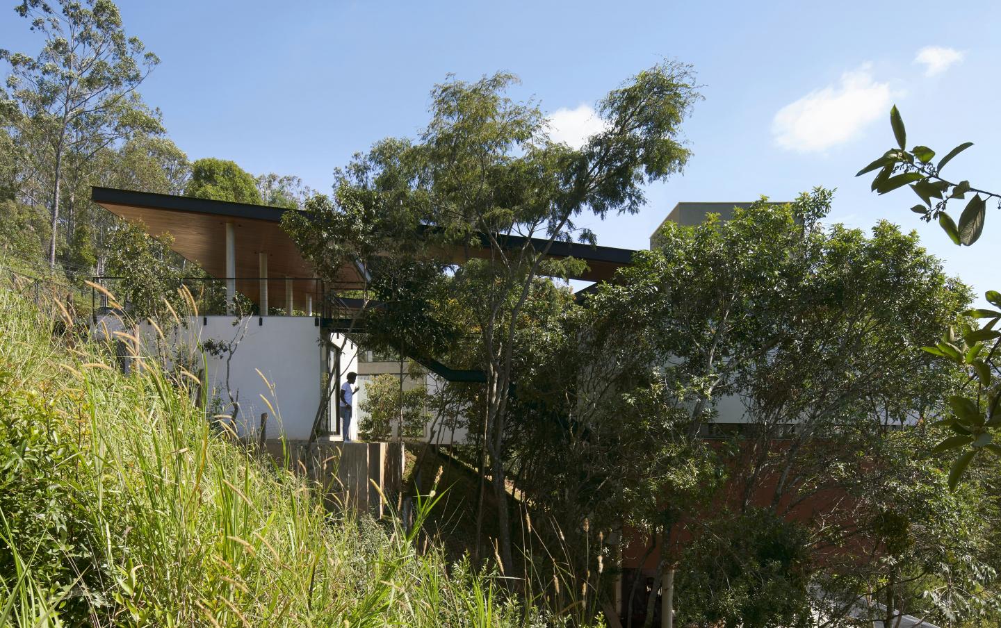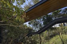 The house is connected to the street through the upper level. On this floor are found the garage and the two accesses to the lower level via two different stairs. On the left end of the plot, the main staircase is located inside the house. On the right side, a metallic ladder suspended over the vegetation is configured as a path through the treetops. This floor is covered by a single pitched roof that slopes and extends itself to the living room and kitchen area, located on the lower floor. This roof is the main protagonist of the house, having an angular cut that defines a central void to keep the vegetation present in the middle section of the site.