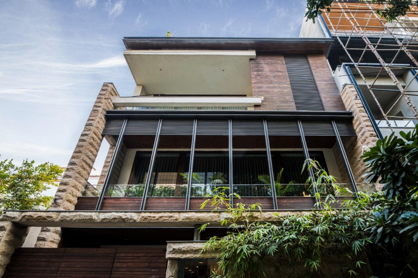 A tasteful elegance manifests through earthy Indian materials and custom-crafted pieces of furniture in this compact 360 square yard three-bedroom home, with its charming 12 feet-high ceilings, located in the heart of Gurugram. At first impression, the facade captures our attention through an unconventional play of materials such as wood, metal, stone, and glass that results in a distinctive exterior. The condensed site area maximizes the height of the villa, inherently bringing a sense of grandeur.