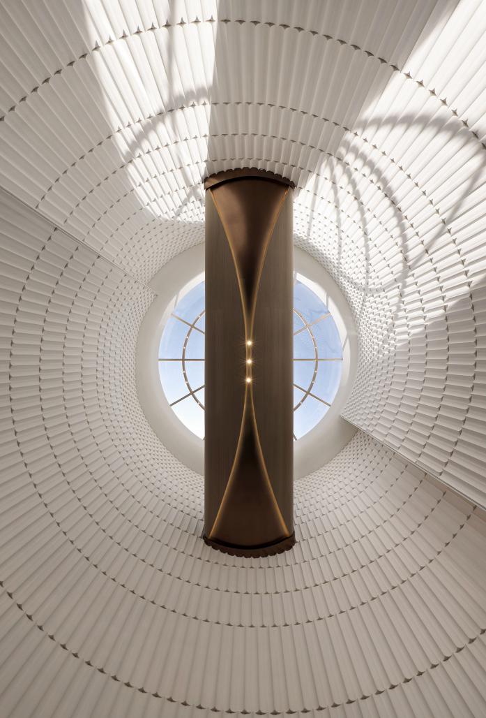 The dome creates a sense of infinite fantasy, where everything is unoccupied and individuals may observe anything in silence in the 12m high, 9m open atrium. The bright side of light and the dark side of shadow will be followed by one's eyes as they aimlessly roam across this area. And when people skim over the pure white texture, regular lines of indentations, and cascading hollow features, a poetic image of layered mountains will appear in minds, bringing people into a fully artistic realm of freedom.