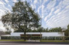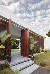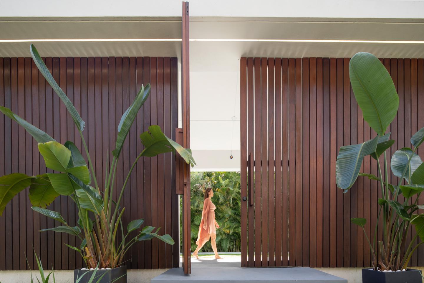 The house with plain thick, pure white walls and linear wood screens creates a minimalist aesthetic and allows the tropical landscape flourish in contrast.