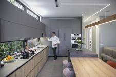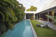 Favoring neutral colors and clean lines, expanses of white walls are complemented by warm wood finishes. The stunning tropical landscape is a key part of the aesthetic, encouraged to flourish over time.