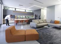 The room layouts represent the simplest form of the Greek Megaron where three sides of the rectangular form are solid walls with a large opening to the forth side. Respectively, an entire wall in each room is a floor to ceiling sliding glass door opening into the courtyard, an element that provides a visual flow throughout the house and creates a great sense of privacy and solace.
