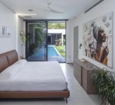 This arrangement maximizes space and privacy and also ensures plentiful natural light. The entrance opens into the courtyard and pool, a central space to which all rooms have access. Each room is equipped with courtyard-facing sliding glass doors, allowing for direct interactions with the rest of the house while preserving the option of privacy.
