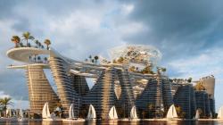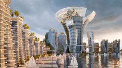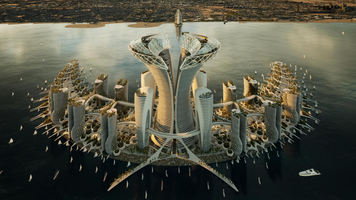 The central tower of the island, with an area of one million square meters, has two general parts: the base of the building, with an area of 670,000 square meters, is dedicated to educational and academic activities, and the crescent on it, with an area of 330,000 square meters, is dedicated to functions including the exhibition hall, research, and development department, science and technology park, library and exhibition of digital achievements. After the central skyscraper, 14 towers with medical functions are added, and on the two ends of the island, 24 hotels are located. All these buildings are symmetrically arranged on both sides of the central skyscraper.