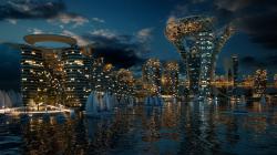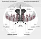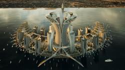 The Artificial Island consists of 1. the Central Tower for research and academic purposes, 2. 14 towers for medical uses 3. 24 Hotel and Residential Buildings, all connected via five different layers of access routes.