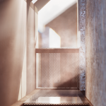 The light can be further manipulated and controlled by sets of mechanical, modular steel - crates, similar to window blinds. Plates inside of each crate revolve around a horizontal axis. The light form the heliostats can be completely blocked by setting the plates in the modular crates vertically, so the modular crate creates a single plane, It can also be directed to light a specific point of the room, by setting a specific angle of revolution of the crate’s plates. The steel modules themselves are able to revolve at a central pivot,making it possible to open the “openwork” steel wall, created by the modular crates like windows, and allow the light reflected by heliostats into the interior without any obstruction.