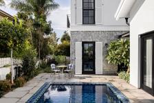 The project style, as described by Nirit, is modern farmhouse. “We took key rustic farm elements and interpreted them in a modern way. The plot is not very big and came with its own challenges, so it was important for us to make the most of the garden space”, she explains. “As a result, we decided to build a hydraulic pool that can be covered when not in use, allowing the owners to use the space fully”. The architectural structure is a play of “blocks” creating a tiered look: a low block with an exposed roof, a central block that includes the entrance and a home office, and a large block comprising of two levels: the ground level in textured stone and the top in clean modern plaster.
