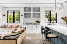 The kitchen is white, powerful, and impressive, with a denim-blue island in its center, that gives it a rustic playful feel. The island’s luxurious worktop is made of veined Carrara marble, which was also used for the countertops. A cozy family corner was planned next to the kitchen, with informal seating corners, a pleasant color scheme, and a TV for the grandchildren.