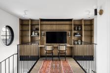 The basement was designed as a grandchildren’s haven. A pleasant space that couldn't feel less like a basement. It includes a dominant carpentry wall that combines natural wood with a screen and cozy seating areas. A deep blue sofa and fully equipped kitchenette offer all that is needed for comfortable entertaining.