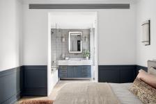 The owner’s warm and inviting home office corner is in a gallery above the entrance. The master bedroom, on the same level, was designed in the image of its owner with a dominant velvet custom-made headboard, boho-chic brass lighting fixtures, a low chest of drawers, and a unique stool. The adjacent wardrobe area was designed in clean lines and leads to the ensuite bathroom, which was tiled with Carrara marble in a similar pattern to that in the kitchen, and a pale blue dresser with brass and copper elements.
