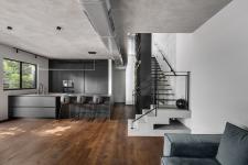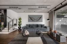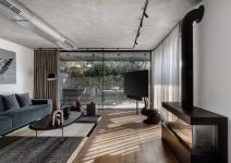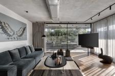 The living room is located further down and serves as a strategic corner. Along with the architect, Horowitz planned curtain walls that open the space up to a well-manicured garden: “This is a very pleasant and inviting space”, he explains. “Industrial design can often be perceived as cold and alienating but thanks to the monotone color scheme and absence of over-the-top textures - we created a very cozy and containing space”. The exposed air conditioning pipes, impressive fireplace, and the combination between wood and concrete give the space a clean and immaculate feel. “The lack of niches and partitions emphasizes the elements in the space - the interior feels less architectural, and the division of the functions is more obvious”, he adds.