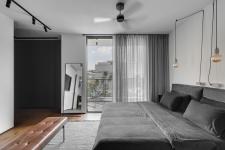 The 35 sqm master bedroom includes a private balcony and was designed in colors and materials similar to those running throughout the property. Horowitz planned a spacious suite that includes a bedroom, ensuite bathroom, and a walk-in wardrobe. “I remained true to the materials and color schemes in order to continue the property’s story from beginning to end”, he explains. “The walk-in wardrobe is reminiscent of the kitchen and the bed resembles the living room sofa. Maintaining the material and color scheme consistency has created a well-balanced and calming space. The plants and artwork add another layer that contributes to the overall desired outcome”.