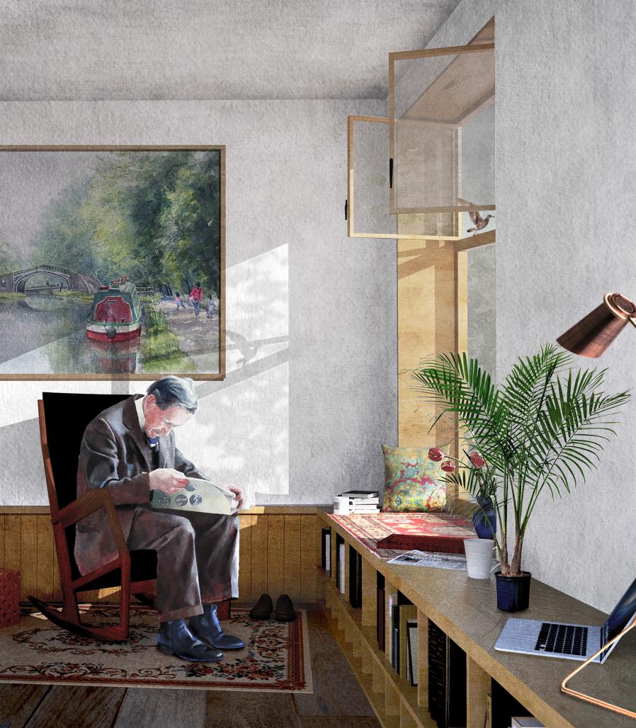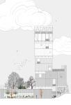 Whilst repairs, maintenance and re fuelling are ongoing with narrow boats, a hostel is provided as short term accommodation. The massing of the tower was inspired by the surrounding architectural topography as well as a solution to the lack of ground space available. The materiality and expression was seen as a clear indication of recognition to the materials used along the edges of the canals in East London and reference to the materiality of narrow boats.