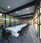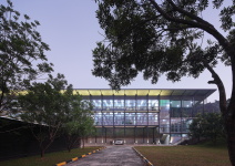 The steep slope of site; almost impossible to build on had to be protected with fair faced RCC part-retaining wall with projections of plinth beams. This was the only in-situ element of structure the balance was assembled on-site within a very short period six months. Solar power, rain water harvesting, zero waste of materials, LED Lighting & VRV AC System, re-usability and the ability to dismantle and re-assemble the entire structure and most of the finishes are the sustainable features of the project. The construction grid was precised from design to construction and critical to avoid cutting and wasting of steel, glass, roofing sheets and even toilet tiles. Virtually zero waste on cutting edges of steel and other materials used was the key design task proposed by the Architect to meet the budgetary constraints. The project’s ultimate success with an architecturally rich, functionally efficient, office building enhancing the co-operate image with overseas visitors/ buyers while motivating the staff. Except the foundation and retaining walls the entire structure can be reused, and the building orientation along the East- West axis ensuring optimum daylight. This building can be categorized as a “Blue Efficient Building” as oppose to a typical green building.