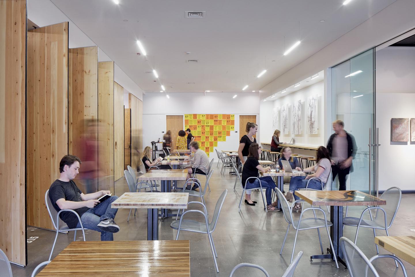 The wall separating the retail shop/classroom from the café was removed and, in its place, a sixty-foot long cross-laminated timber (CLT) wall now provides warmth and tactility. Half of the CLT wall is comprised of six pivoting panels capable of opening the café to the classroom.