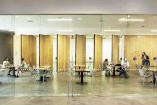 This adaptability is echoed by the café's integration with the gallery via a telescoping sliding glass wall, alleviating the gallery's former lack of visibility and interaction. The contents of the gallery are now on full display; movement from one space to the other is fluid.
