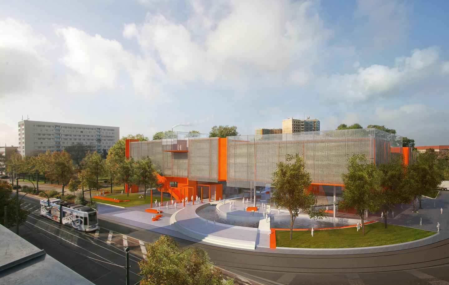 The building responds to its setting with natural/displacement ventilation and the detached meshed façade that acts both as sun shading and as a protective skin in the winter. The latter pays homage to the historical architectural elements of the original Bauhaus while extending the museum to the city and blurring the boundaries of the park.