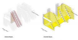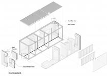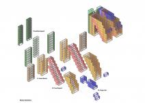 The modules are the full width of a tower. This allows for an easy stacking method which begins to recede in order to accommodate zoning regulations. Within each module is a mix of one the hotel units, corridors, and patio spaces. Each module will be fabricated off-site and delivered prepped for installation.