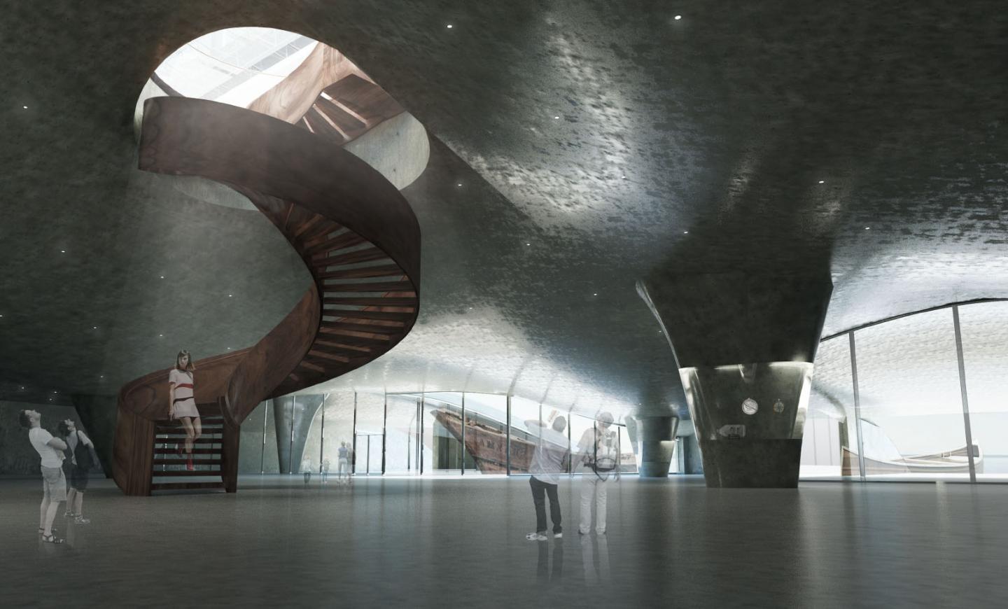 The design of the museum features an undulating green roof and a light box that rests above it. The earth roof transforms into a shaded landscape area that provides public space for gathering. The lower gallery offers a subterranean experience while the upper gallery is characterized by its poly-carbonate facade that filters light. The stark contrast between the dark lower floor and the light upper gallery is an analogy to the experience on a ship or vessel.